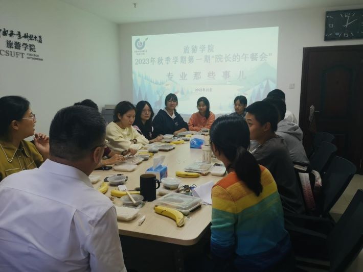 2023年10月31日中午,旅游学院2023年秋季学期第一期“院长的午餐会”在博文楼北1108举行。学院副院长(主持工作)罗芬教授、党委副书记洪梅、2023级辅导员黄玲与2023级10名新生代表共进午餐,畅谈“专业那些事儿”。