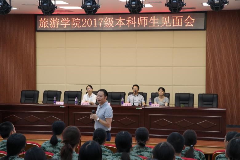 见面会开始,由钟永德院长致辞,他表达了对2017级新生的热烈欢迎。首先,向新生们介绍了旅游学院的发展历史、现状及发展前景。其次,介绍了学院专业设置,分别就旅游管理、酒店管理、会展经济与管理三个专业展开。最后,介绍了学院对于学生的人才培养,包括课程设置,培养模式,实习就业,国际交流等。随后,胡建刚书记用富含哲理性的话分别从学习能力、实践能力、创新能力、组织能力四个方面对新生们提出了要求,同时,对新生们寄语厚望,希望同学们能够扩大格局,心怀祖国、民族、天下。
