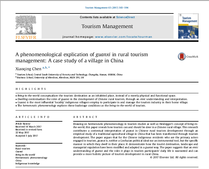 据悉,最新一期的旅游研究影响因子排名第一期刊《Tourism Management》(SSCI一区期刊、ESI期刊,影响因子:4.7)杂志刊发了我校旅游学院讲师陈晓磬老师的文章,题目为《乡村旅游管理中“关系”的现象学诠释:以中国江西篁岭为例(A phenomenological explication of guanxi in rural tourism management: A case study of a village in China)》。