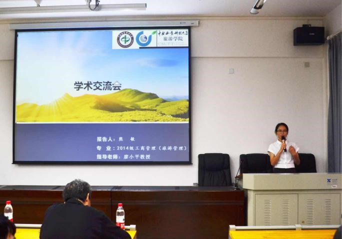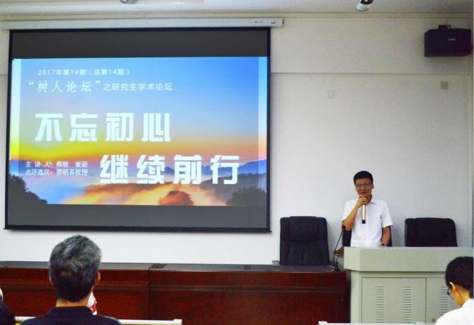2017年5月25日晚19点,由中南林业科技大学研究生工作部主办、旅游学院承办的“树人论坛”之研究生学术论坛——2017年优秀毕业生学术报告在文综楼南905如期开讲。本期论坛由2016级硕士研究生魏普同学主持,2014级工商管理硕士熊敏、森林游憩与公园管理专业硕士崔新两位优秀的学姐学长主讲,硕士生导师罗明春教授担任点评嘉宾。旅游学院院长、硕博导师钟永德教授;党委书记胡建刚;旅游学院副院长戴美琪教授;研究生秘书胥俊老师也亲临报告会现场,聆听毕业生们的精彩分享。