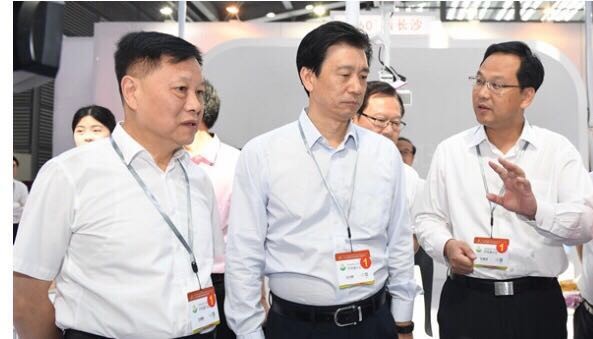 (湖南省委常委、宣传部长蔡振红(前排中间)详细了解湖南展馆情况)