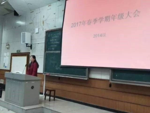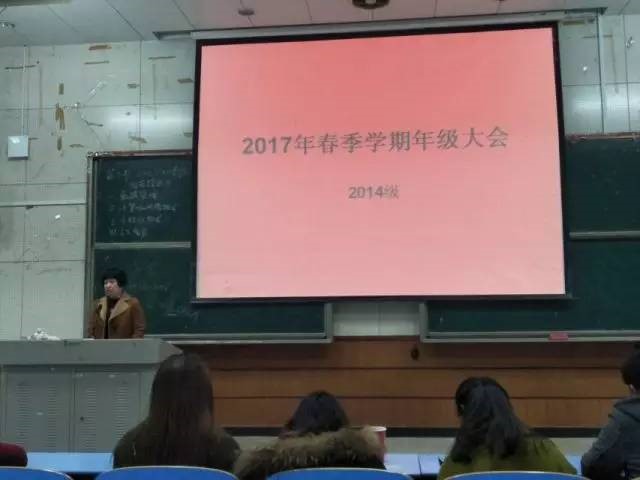 2017年3月2日晚,2014级全体同学在生科楼001教室召开本学期第一次年级大会,旅游学院党委副书记洪梅、旅游学院2014级辅导员彭湘宜老师参加了会议,会议由彭湘宜老师主持。