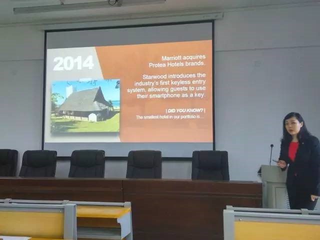 酒店管理专业负责人周志宏教授讲话,并介绍实习相关内容,包括实习机会(招聘岗位等)。