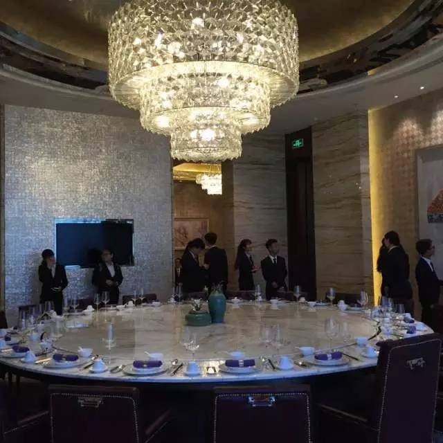 首先来到的是中餐厅,它的整个设计风格是古香古色,主要以灰派的风格为主,有比较多水墨的元素,中餐厅有17个包房,每个包房的名字都是以湖南著名的自然景观,或者是人文景观来命名,我们参观了最大的一间包房——湘江厅,此厅最多可容纳26位客人,采用电动转盘,还有秘密通道,装饰相当的奢华精致。