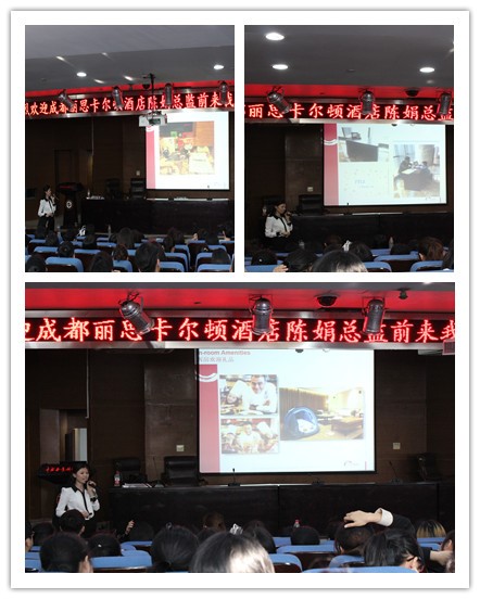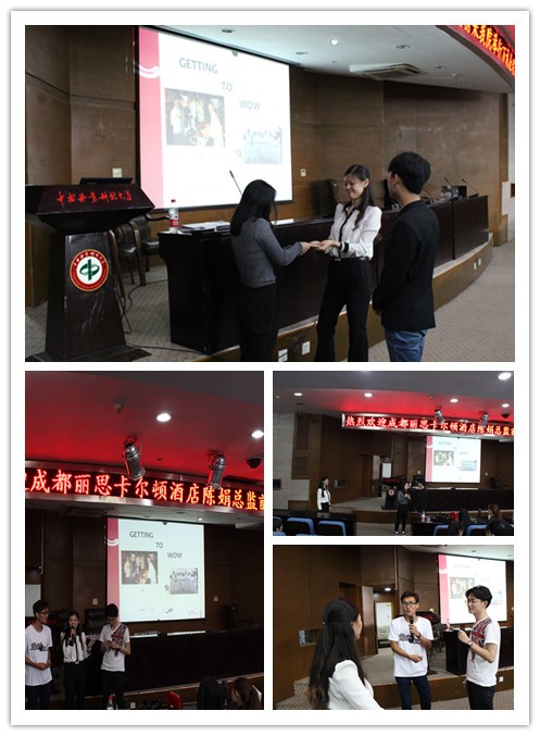 其次,陈总监用丽思酒店丰富的案例诠释了丽思卡尔顿酒店的服务精髓,以其在酒店做butler的经历叙述了她在酒店为VIP客人服务的经历和在GETTING TO WOW互动环节中,陈娟总监对同学们的角色扮演进行了一一点评,并赠送酒店礼物作为奖励和纪念。帮助学生们认识到作为一名酒店人应该具备何种素质和能力。