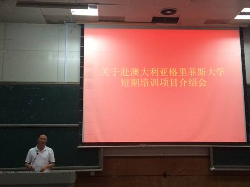 2015年6月10日,旅游学院在生科楼002召开关于赴澳大利亚格里菲斯大学短期培训项目介绍会,本次介绍会由旅游学院院长博士生导师钟永德教授主持。旅游学院实习就业办主任胥俊老师、2012级辅导员曾浩老师、2014级辅导员熊硕老师以及学院2013级、2014级研究生,2012级、2013级本科学生参加介绍会。