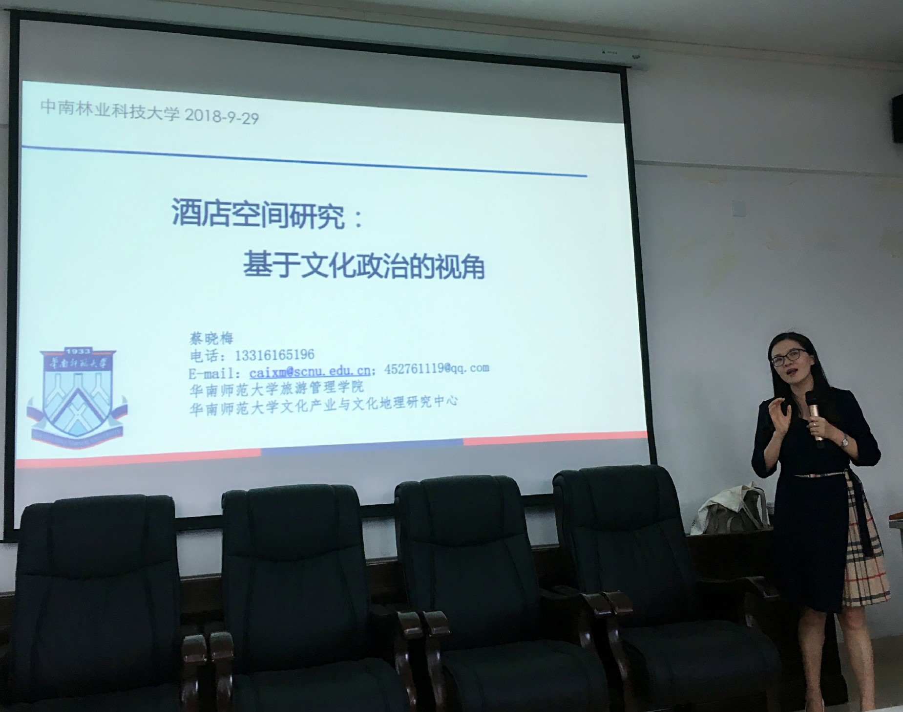 2018年9月29日下午2点半,华南师范大学旅游管理学院副院长蔡晓梅教授应邀到我校进行学术讲座,讲座在文综楼南905开始。本次讲座的主题是酒店空间研究——基于文化政治的视角。本次嘉宾讲座的主持人是旅游学院公园管理系主任罗芬老师;参加本次嘉宾讲座的老师有旅游学院酒店管理专业创始人之一,蔡师姐的导师彭学强老师;湖南工业大学商学院副院长,中南林旅游学院校友刘中艳老师;旅游学院副院长戴美琪老师;酒店管理系杨芳、朱玲、胥俊、张娓老师,还有来自学院多个年级的本科生和研究生们。