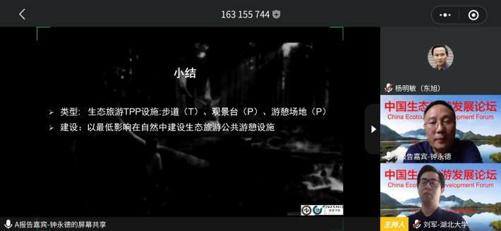 全国知名生态旅游专家学者“云”聚论坛,主题报告精彩纷呈,既有对生态文明背景下生态旅游发展理念的探讨,也有对区域生态旅游发展实践的思考,既有高度,又有广度和深度。我院院长钟永德教授建议以最低影响在自然中建设生态旅游公共游憩设施,并对生态旅游的步道、观景台、游憩场地等设施给出了规划和设计思路。戴斌院长指出疫情过后生态旅游的研究方向,即“如何通过生态教育、生态解说引导游客的绿色消费行为,如何提升游客的生态环保意识,促进负责任的旅行。”马勇教授表示,中国旅游研究院生态旅游研究基地将积极围绕生态旅游和绿色发展,开展深入和广泛的研究。