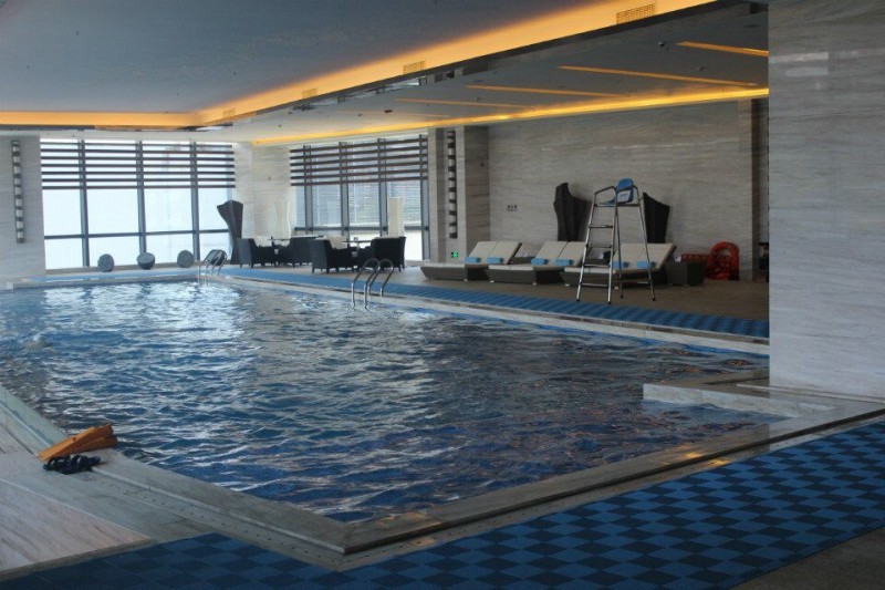 酒店的第5层包括,游泳池、健身中心、水疗区、桑拿室、瑜伽室等,140平方米的室内恒温游泳池晚上灯光映照,就像是在星空下一样,非常畅快的体验,各种器械配备齐全而且高端。