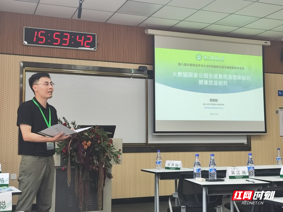 中南林业科技大学国家公园与旅游学院党委委员吴江洲主持第八届中国林业学术大会森林公园与森林旅游分会场学术交流会。