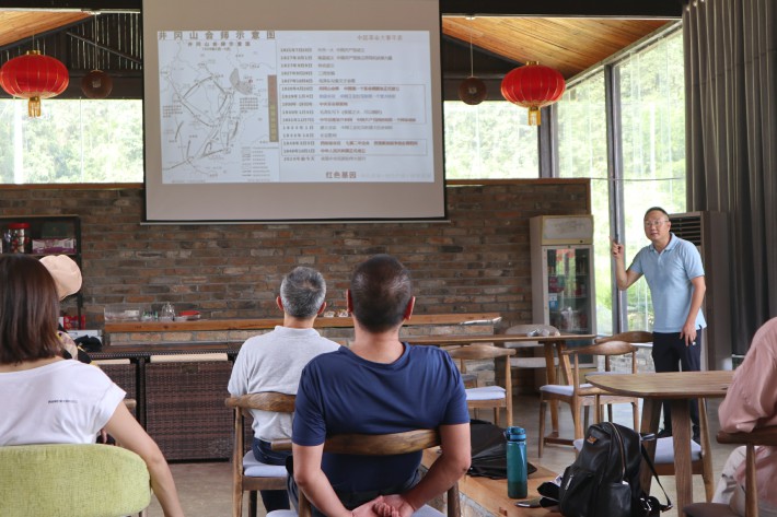 接着,钟永德院长给教职工党员和要求进步的教职工积极分子讲授湘赣边区革命斗争史的主题党课,党课从地理、经济、当时社会现状等维度对井冈山革命根据地的建立、发展进行解读,带领大家重回波澜壮阔的革命年代,感受革命先辈的不怕牺牲的奋斗精神。