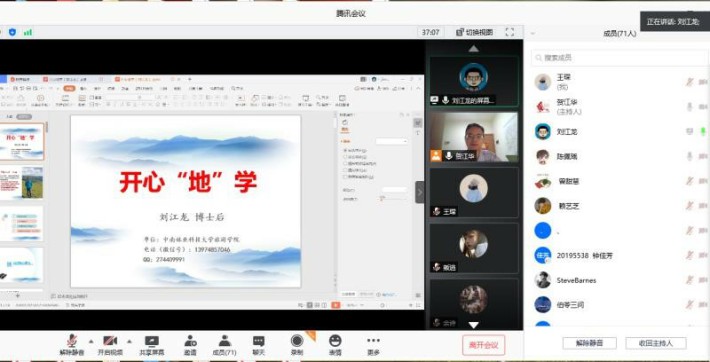2020年7月24日晚八点,《自然教育》在线精品课程系列讲座:开心“地”学,在腾讯会议顺利举行。本次讲座邀请刘江龙博士对“大学生旅游专业综合技能大赛”进行交流分享,由贺江华博士主持。中南林业科技大学、中南林业科技大学涉外学院、遵义师范学院等多所高校学生和社会从业人员参与了此次讲座,社会反响良好。