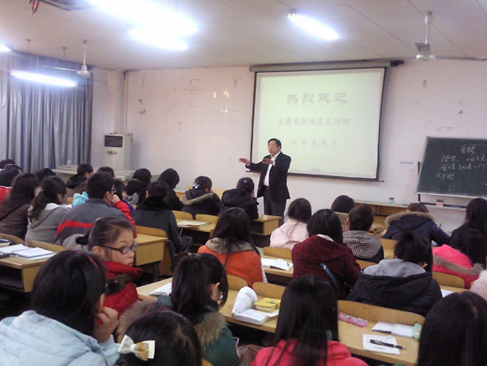 刘华武总经理首先给大家介绍了圣爵菲斯酒店的特色及酒店“以人为本”的企业精神——“后台服务前台,前台服务客人”;然后从目前各酒店的综合境况,概括了五星级酒店管理人员应具备的素质。在讲座现场,同学们踊跃提问,刘总一一做出解答,给同学们传授了管理企业的经验,会场气氛十分活跃。