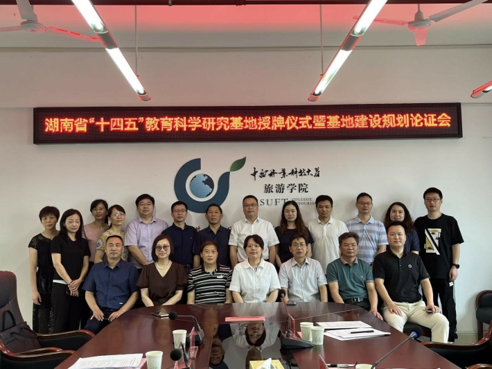 620日上午,湖南省“十四五”教育科学研政校企融合研究基地授牌仪式暨建设规划论证会在我校旅游学院举行。湖南省政协委员、湖南省文化和旅游厅二级巡视员肖自裕,中南林业科技大学副校长仇怡,湖南省教育科学研究院教育规划所所长、省教育科学规划办常务副主任黄龙威,湖南省教育科学研究院教育规划所副所长、省教育科学规划办副主任谢剑虹,湖南科技大学教育学院党委书记李炳煌,湖南华旅国盛规划设计院有限责任公司董事长潘铁军等出席会议,会议由社科处处长侯茂章主持。