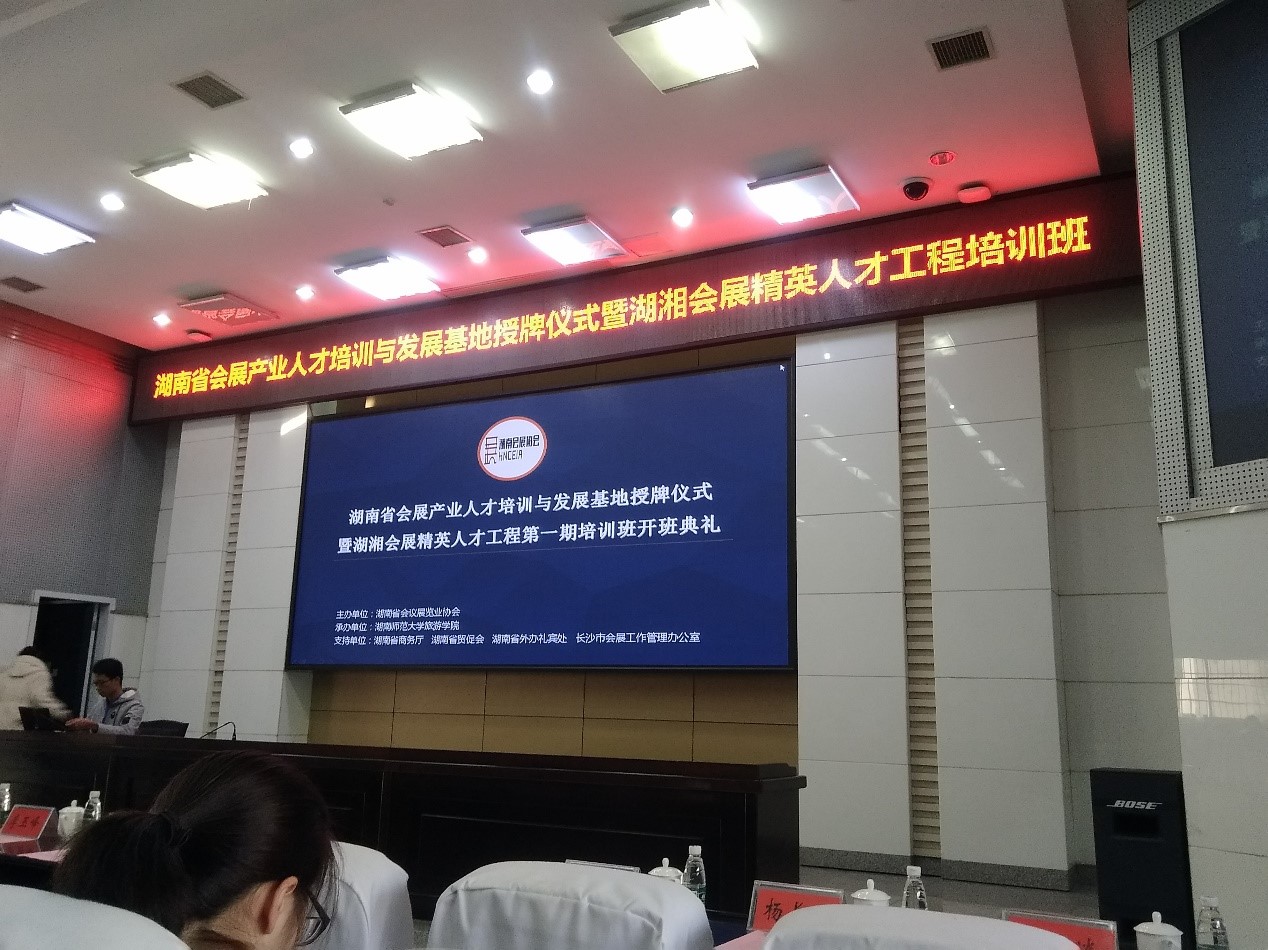 2017年12月25日,由湖南省会议展览行业协会主办的湖南省会展企业人才培训与发展基地授牌仪式暨湖湘会展精英人才工程第一期培训班开班典礼及培训在湖南师范大学举行。我院会展教研室文岚老师、谢可夫老师及会展专业学生谭文凯、刘瀚东、苏红玉、田碧盈、谭丽桃、钱妙、王健飞、吴梦瑶参加了此次培训。