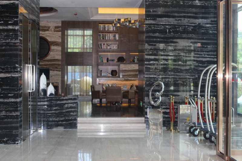 首先来到的是中餐厅,它的整个设计风格是古香古色,主要以灰派的风格为主,有比较多水墨的元素,中餐厅有17个包房,每个包房的名字都是以湖南著名的自然景观,或者是人文景观来命名,我们参观了最大的一间包房——湘江厅,此厅最多可容纳26位客人,采用电动转盘,还有秘密通道,装饰相当的奢华精致。