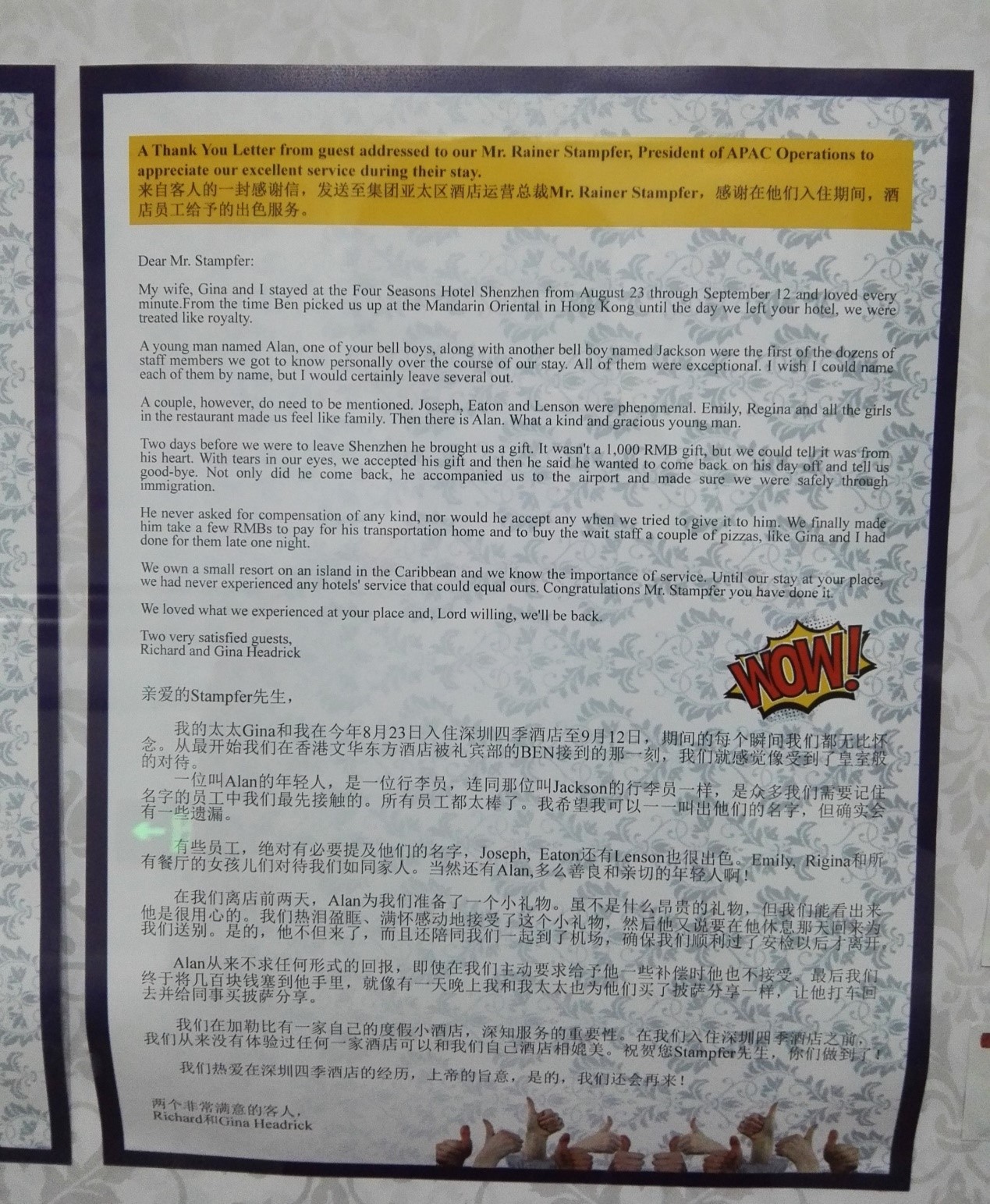 孙晓同学在深圳四季酒店礼宾部实习,近期酒店管理层收到转发至四季酒店集团亚太区酒店运营总裁的顾客表扬信,并张贴在员工公告栏给予表扬。客人Richard and Gina Headrick 在信中对孙晓同学(Alan)在客人入住期间的出色服务表示感谢,并把表扬信发了四季酒店集团亚太运营总裁Mr. Rainer Stampfer