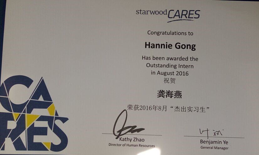 龚海燕同学在深圳瑞吉酒店专职管家部实习,实习表现优秀,被评为20168月深圳瑞吉酒店“杰出实习生”,获得了总经理亲笔签名的证书以及酒店价值1000元的双人自助晚餐券。