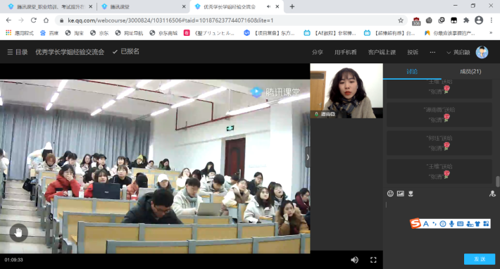 分享会第二部分为线上分享,往届优秀学长学姐通过腾讯课堂平台为我们分享了他们以往的一些实习和保研经历学长郭鑫强调了把握校招机会的重要性,提前准备好自己的简历,简历内容及风格的要素也是值得注意的。随后,依次学姐钟星、张雅婷、项亚丽和谭雨薇对于她们的保研经历进行了分享。尽管她们大多数在准备期间都比较仓促,但是由于前期积累了较多经验和经历,依旧进入了自己心仪的学校。我们也应当向学长学姐们积极靠拢,不断积累经验丰富自己的学习经历,做到忙而不乱,弄清自己的目标与定位。