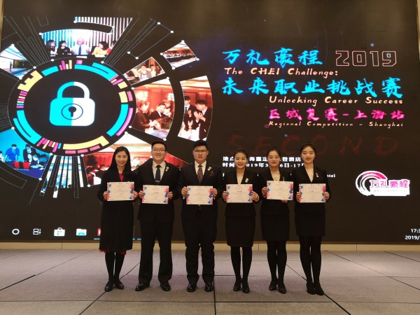 万礼豪程2019未来职业挑战赛上海站本科组区域复赛于2019年3月16日在上海嘉定喜来登酒店顺利落幕。由我院酒店管理系主任杨芳老师指导,2017级酒店管理班方仲楷、尚琬、刘子琛,2016级酒店管理2班陈明君、袁绍群组成的凤凰队,以“曲和流觞主题民宿”商业计划书和全英文现场演示及答辩,在比赛中表现优秀,荣获区域复赛一等奖,率先晋级全国本科组四强,成功进军今年7月即将在上海举行的全国总决赛。