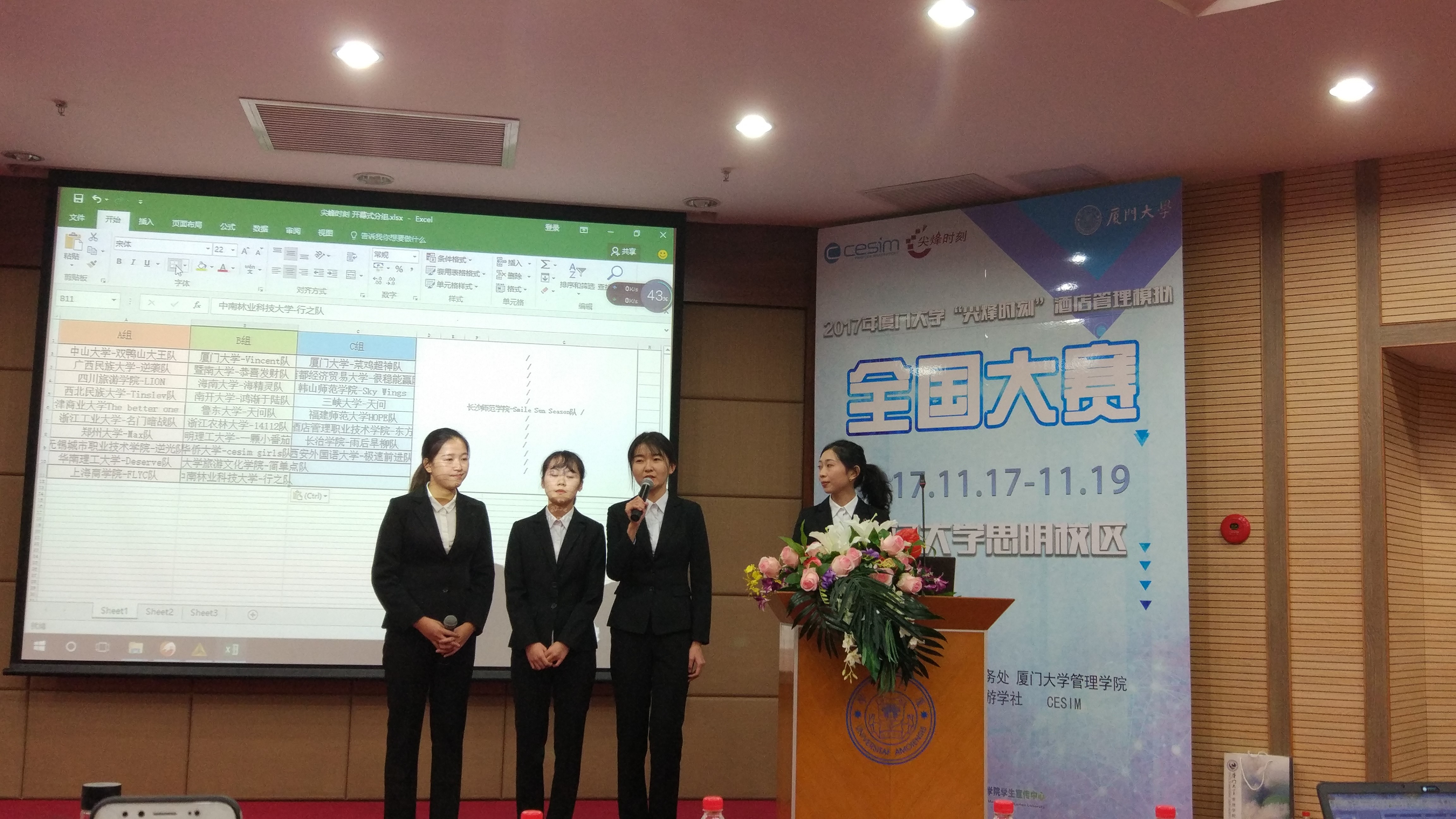 2017111718日,由“尖烽时刻”酒店管理模拟大赛全国组委会主办、厦门大学承办的第二届“尖烽时刻”酒店管理模拟大赛总决赛(以下简称决赛)在厦门大学举办。本次大赛共吸引了全国53所高校262支队伍的900多名选手报名参加,经过激烈的初赛和复赛,其中28所院校29支队伍进入了总决赛,由我院朱玲和邹阳老师指导,由林茹云、戴思议、董章苇、林丹丹同学组成的“行之队”等3支队伍荣获一银二铜的优异成绩,并获得优秀指导老师奖,我校获优秀组织奖。