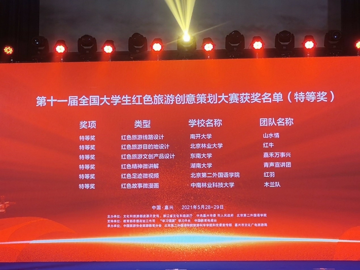 (旅游学院 杨芳)2021年5月28日至29日,以“青春追寻红色路 不忘初心跟党走”为主题的第十一届全国大学生红色旅游创意策划大赛总决赛在浙江省嘉兴市举办。本届大赛设置“红色旅游线路设计”“红色旅游目的地设计”“红色文创产品设计”“红色足迹微视频”“红色精神微讲解”“红色故事微漫画”6大参赛类别,经过2天的激烈角逐,中南林业科技大学与南开大学、湖南大学、北京林业大学、东南大学、北京第二外国语学院等6所院校的参赛队伍分别获得各参赛类别的特等奖。