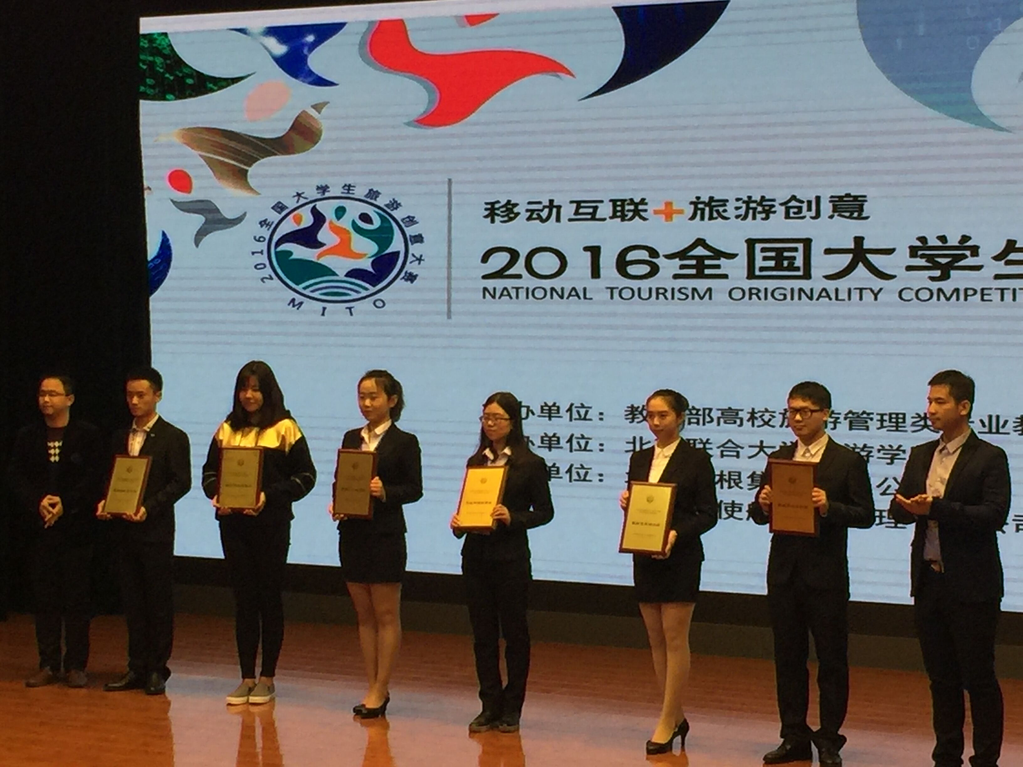 本次大赛是由教育部高校旅游管理类专业教学指导委员会主办的旅游管理专业唯一的全国性赛事,由北京联合大学承办。大赛自2016年月4启动以来,共有来自全国40多所高校的85支队伍报名参赛。经过专家的严格评审,共有包括我校在内的四川大学、西南交通大学等18所高校的21个参赛作品入围决赛。在决赛中,我院参赛队伍通过精彩的陈述和现场答辩夺得一等奖和最佳作品创意奖。项目现场就得到了全景客、中青旅、北京立根集团和北京天使舱投资管理有限公司的重点关注,也获得了相关风投公司的投资意向。