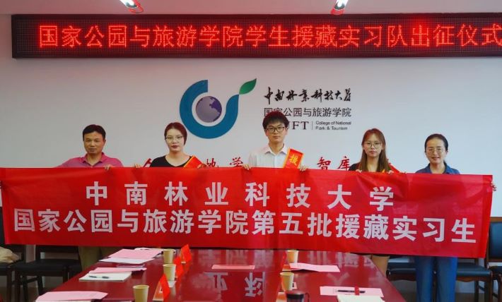 7月15日下午,中南林业科技大学国家公园与旅游学院第五批援藏实习队出征仪式在博文楼南1002会议室举行,学院党委副书记张卓主持仪式。仪式上,校团委书记殷丹、宣传统战部副部长廖乐平、团委副书记刘洋为即将出征的刘泽杰、唐子萱、曹紫丹同学佩戴荣誉绶带,魏昕副教授、张清副教授为三位同学授横幅,学院党委书记洪梅出席仪式并讲话。